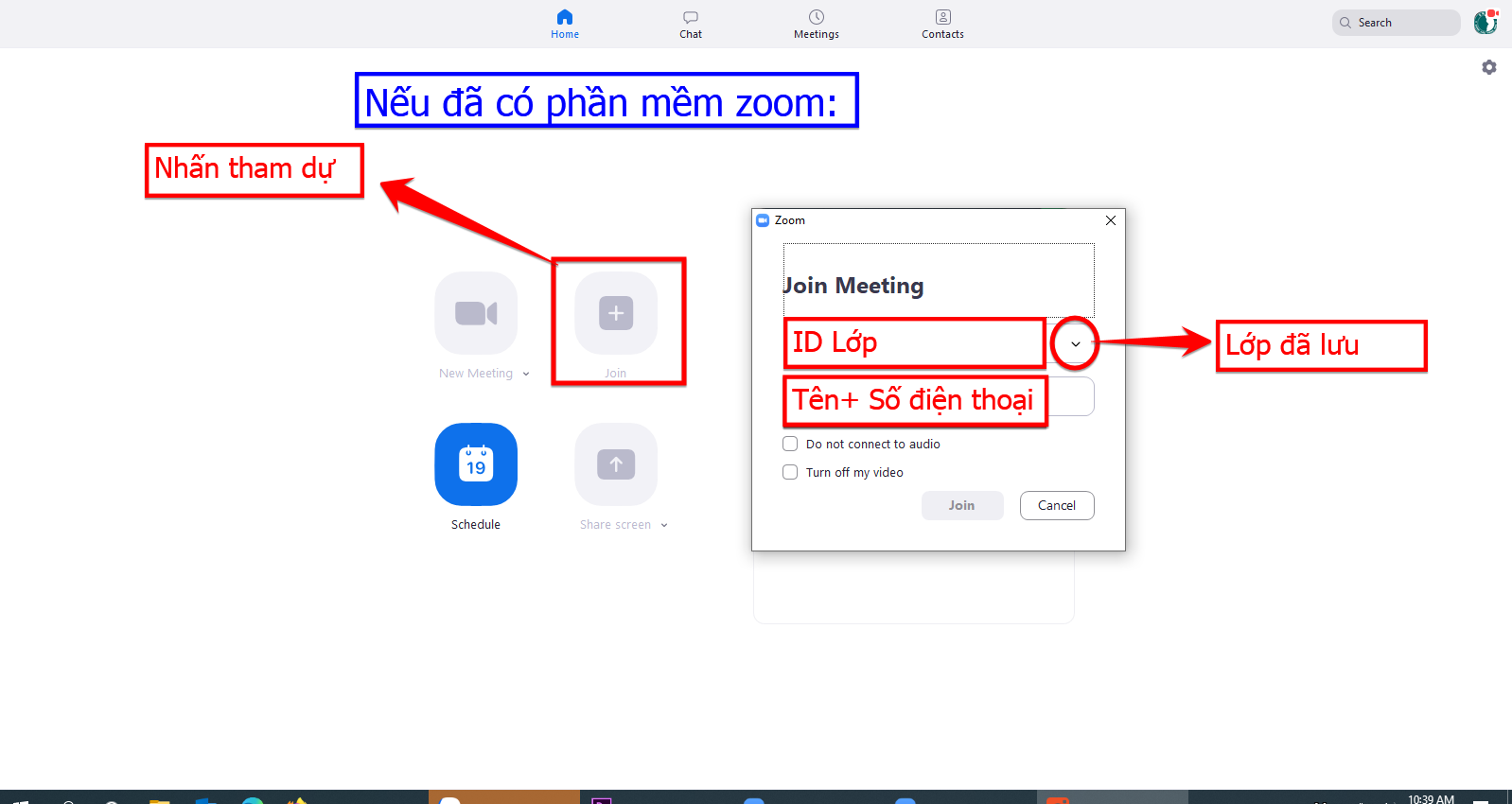 Bước 1: Chọn phần mềm Zoom và chọn ID/ mật khẩu (nếu có)